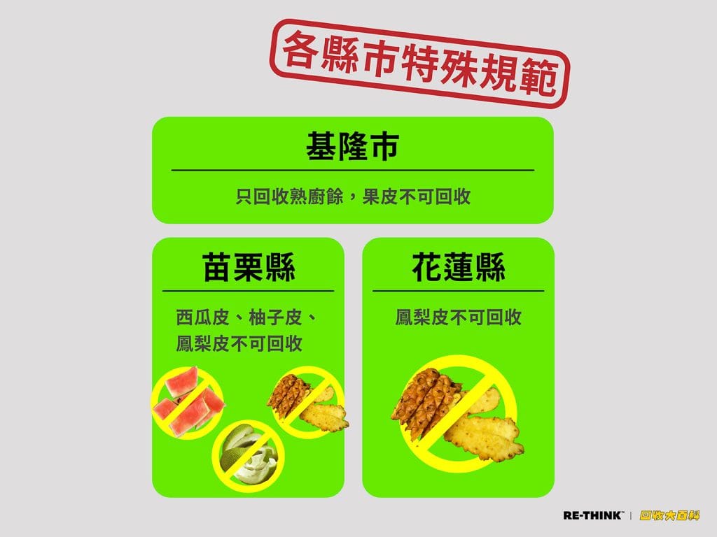 - 基隆市:只回收熟廚餘,果皮不可回收