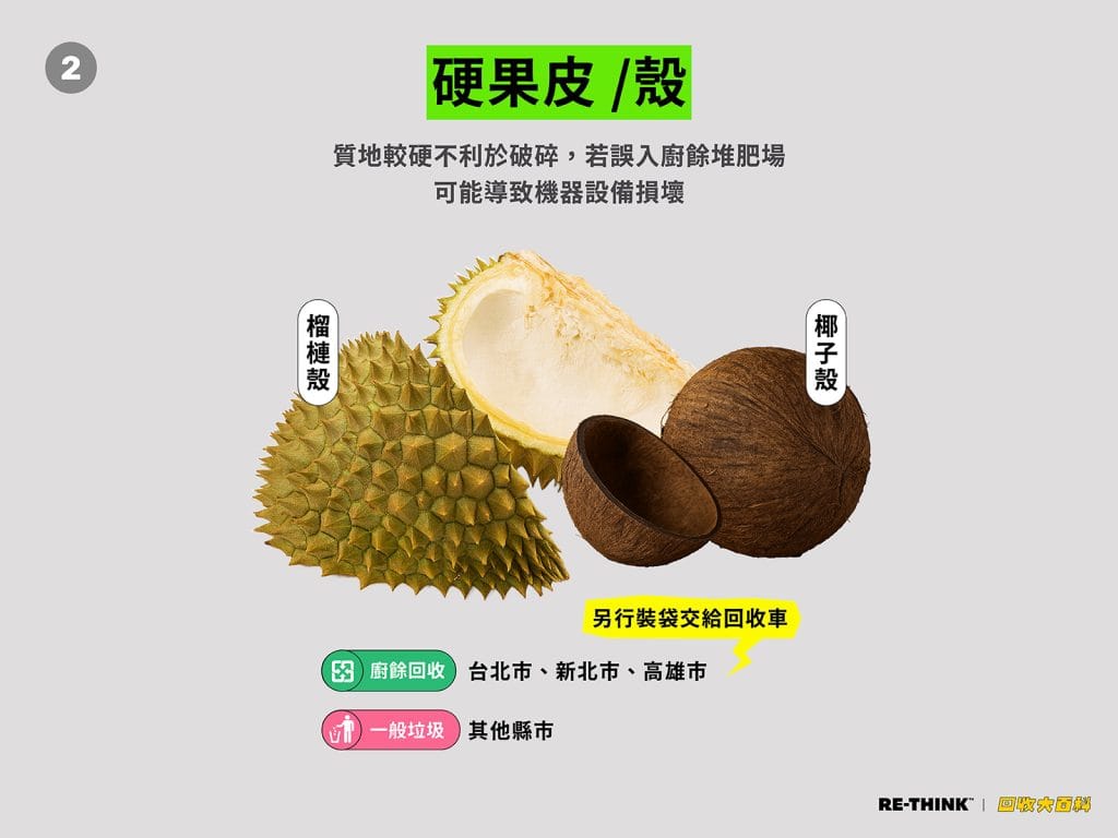 椰子殼、榴槤殼等屬於「硬果皮」,質地較硬且不易破碎,如果誤入廚餘堆肥場,可能導致設備損壞,因此並不是每個縣市都有能力處理這類果皮。