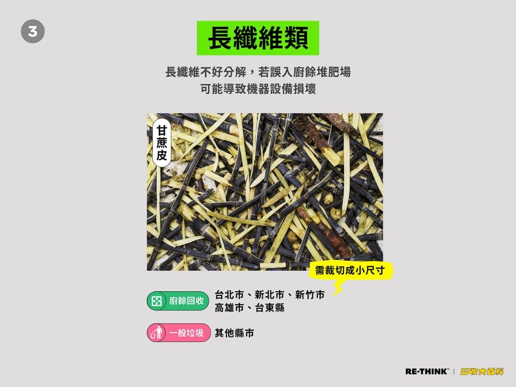較常見的甘蔗皮是長纖維。因為纖維特性不易分解,若誤入廚餘堆肥場可能導致設備損壞,因此這類果皮也不是每個縣市都有能力處理。
