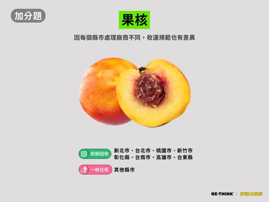 因為各縣市處理廠商不同,收運規範也有差異。雖然有些縣市不回收果核,但如果水果壞掉需要整顆丟至生廚餘/堆肥廚餘,不需要特別先將果肉、果核分離。