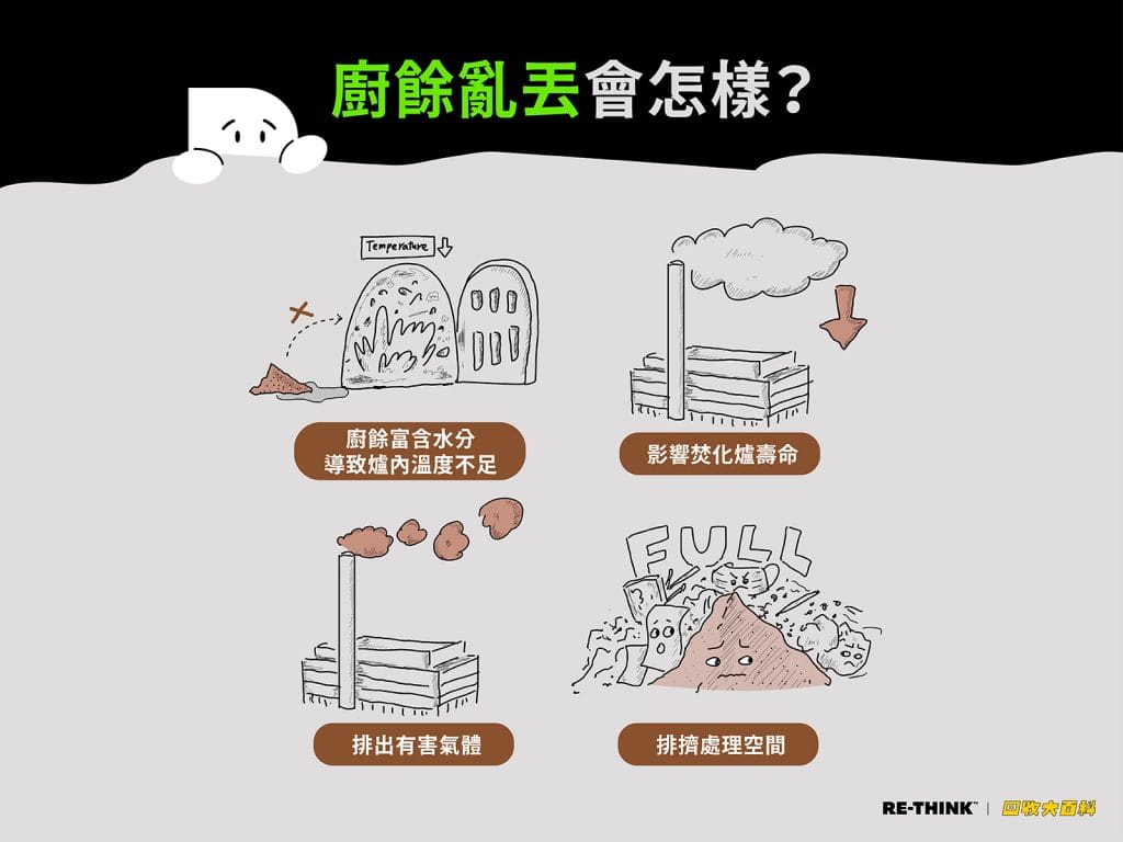 因為廚餘的水分含量高,會導致焚化爐能源效率無法充分發揮,加上台灣飲食習慣偏重口味、含鹽量高,不利焚化爐對戴奧辛的控制,會增加排放有害氣體的風險。長久下來,可能導致垃圾處理系統不堪負荷,最後還是影響到我們自己!