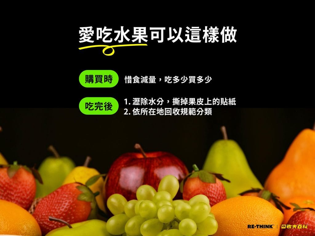 愛吃水果也同樣愛護環境,可以很簡單!只要記得在購買時,吃多少買多少,避免因為一次買太多,導致水果變質浪費;把果皮上的貼紙撕掉,稍微瀝除水分,依照所在地的規範將果皮好好分類丟棄。