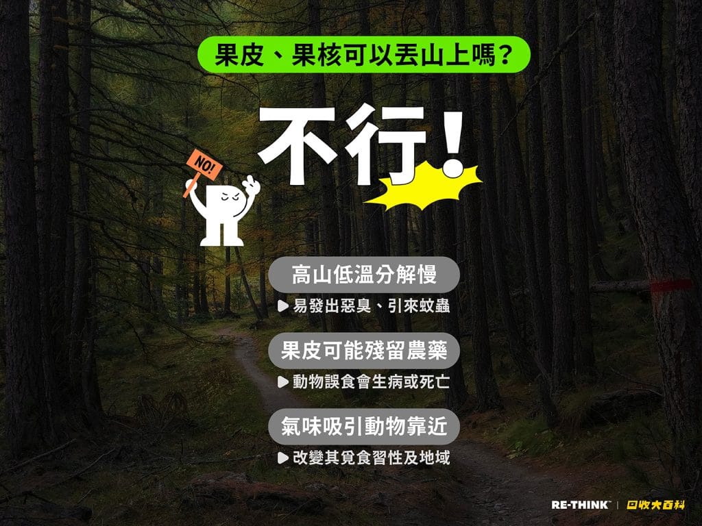 除了平常在家處理果皮分類,許多人喜歡爬山、露營,以為到山上把果皮隨手丟掉,就會「自然分解」,這其實是一個常見誤解!以下是 3 個不該把果皮丟在山上的重要原因: