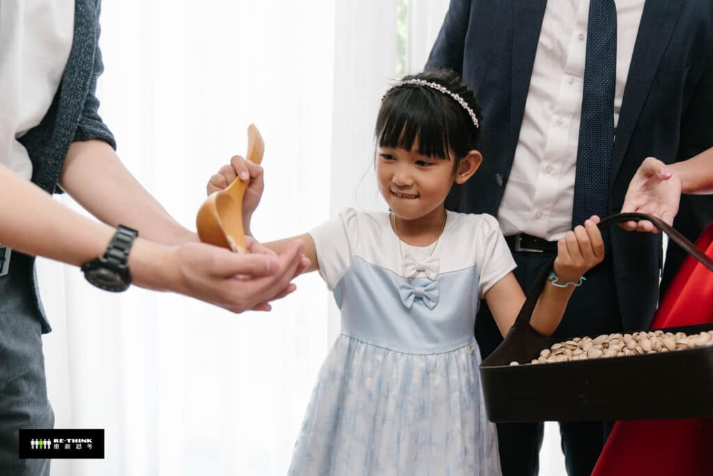 果殼可以廚餘回收,以湯勺運送減少接觸,拿到的大家(還有幫忙的小花童)都很開心哦!