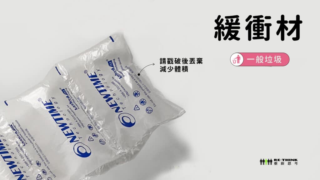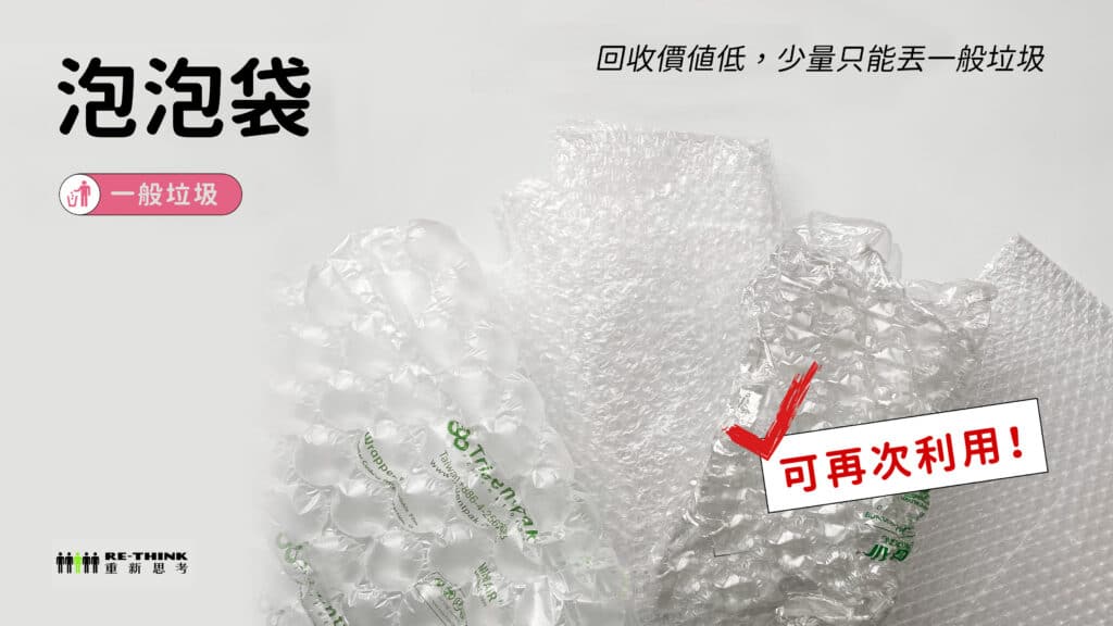 泡泡袋雖然材質單一卻只能當一般垃圾的經典案例。膜狀塑膠的再利用價值較低,只能壓縮後丟進一般垃圾中。