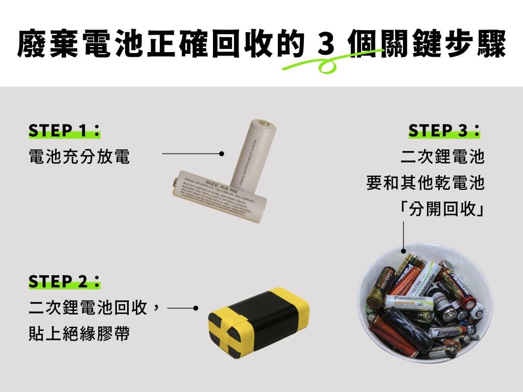 考量可充電鋰電池可能仍有殘存電量,回收前要在正負極上貼絕緣膠帶,避免短路、起火。