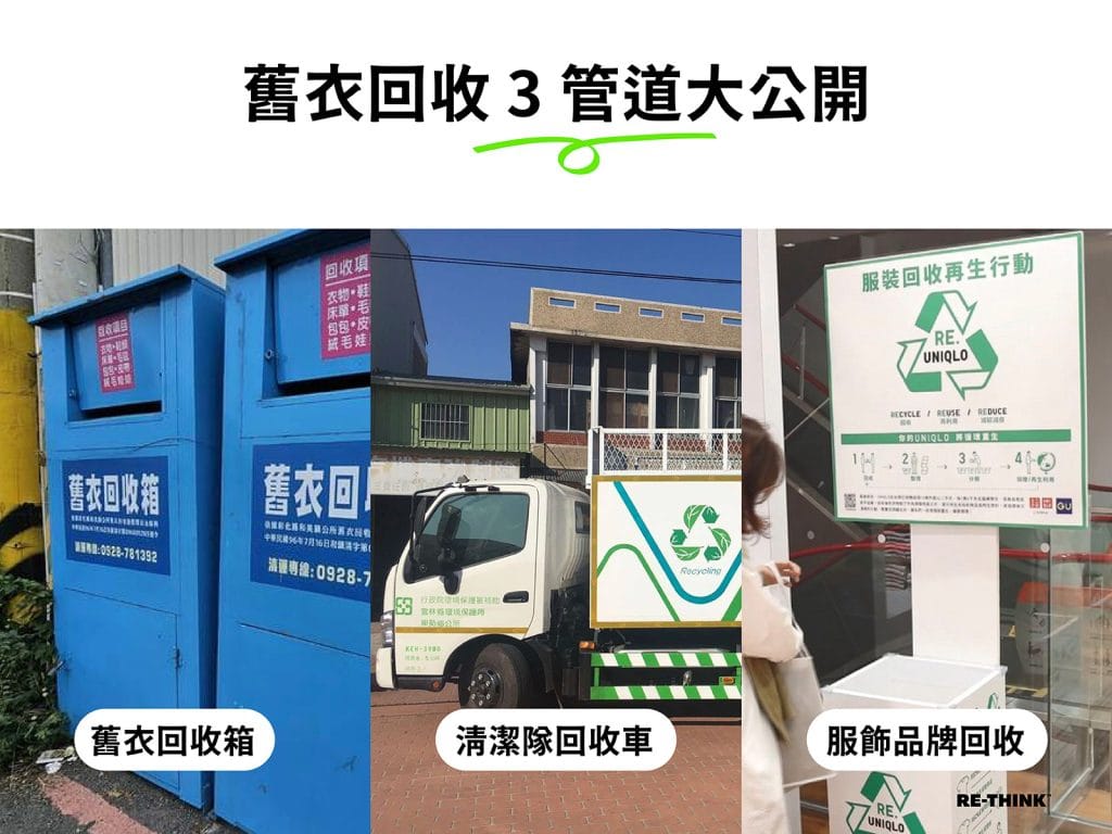 許多社區巷弄或是公園、學校周邊等,都可以找到舊衣回收箱。這些舊衣回收箱多半是由地方政府核准,讓社福團體、回收業者申請設置。他們會篩選狀況良好舊衣服再利用,通常是捐贈、轉賣或外銷。