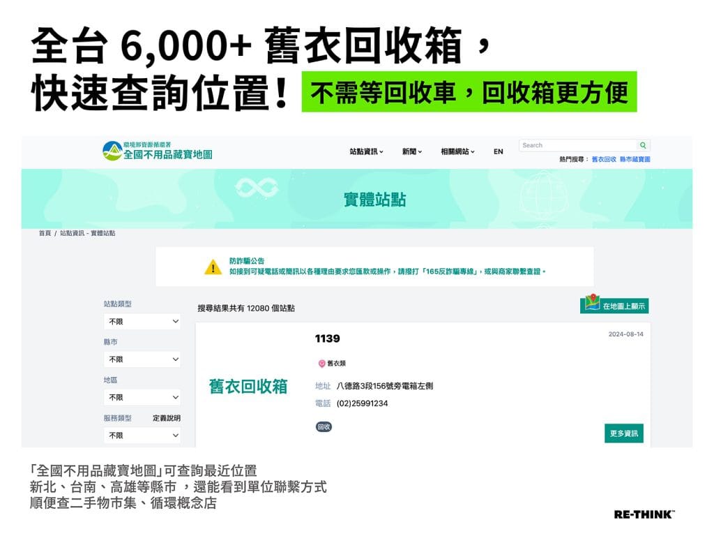 參考環境部資料,全台有超過 6,000 個舊衣回收箱,你可以在「全國不用品藏寶地圖」網站上,輕鬆查詢離你最近的舊衣回收箱位置。