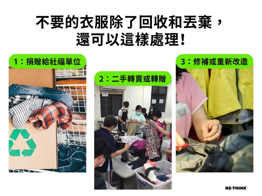 - 捐贈給社福單位 : 許多社福單位會不定期公布正在回收的舊衣類別,並讓弱勢族群直接參與舊衣的回收與分類整理工作,透過舉辦義賣回收衣物,讓作為弱勢族群的薪資收入。
