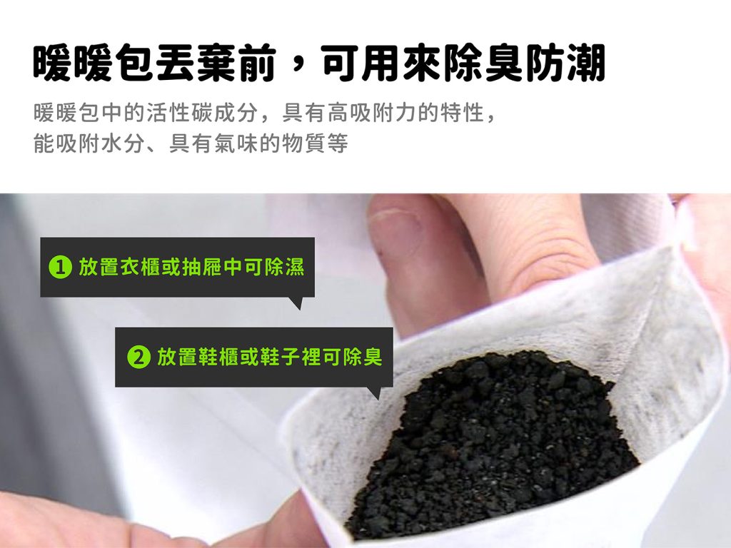 暖暖包中的活性碳成分,具有高吸附力的特性,能吸附水分、具有氣味的物質等,可以將用過的暖暖包冷卻後放在衣櫥、鞋櫃,用來除臭防潮。有網友分享親測結果,說他將用過的暖暖包丟放在靴子裡「後來就比較少發霉了!」
