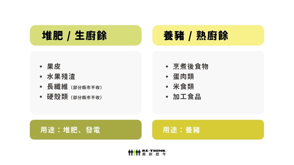 台灣廚餘回收處理主要分成兩大類,養豬廚餘收的是人吃剩的東西,堆肥則是一些蔬果外殼,因為這些外殼通常具有長纖維、硬殼性質,難以被豬隻消化。有些縣市則會以生、熟廚餘回收做分類,但原則上也是以是否能供養豬使用進行區分。