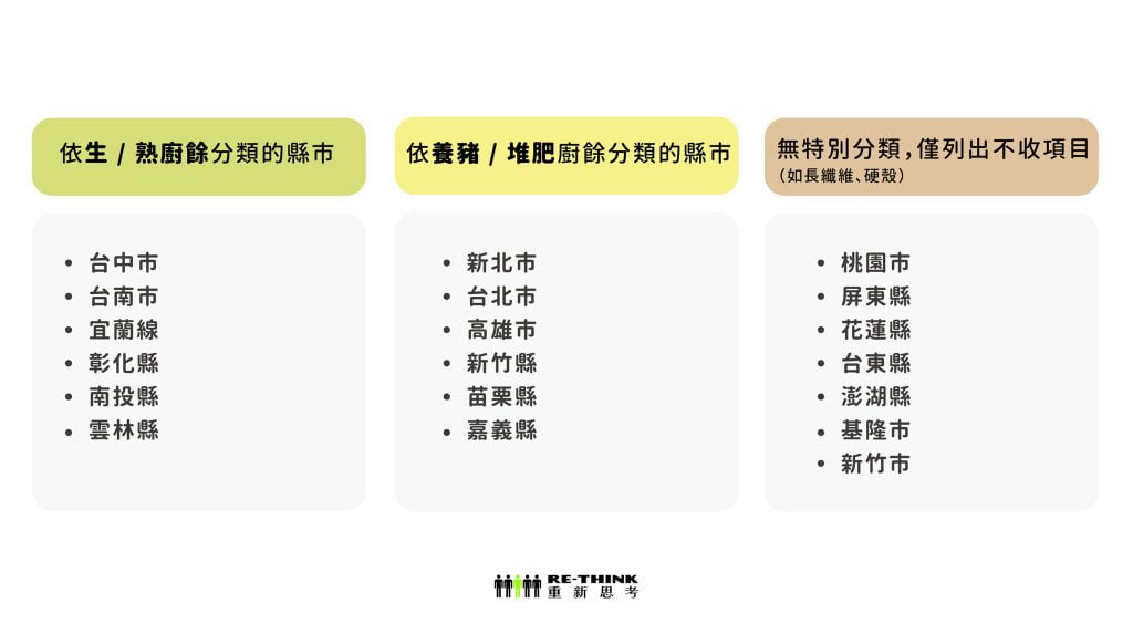 其實各地區收的廚餘回收項目,會因當地有的廚餘回收處理設備而不同,也導致會有全台各地廚餘回收標準不一致的情況。但沒關係!無論你家的廚餘是什麼,都讓 RE-THINK 為你破解!