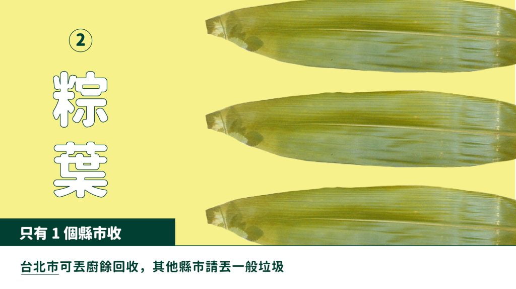 粽葉:難回收!屬於長纖維不好分解,無法當廚餘回收
