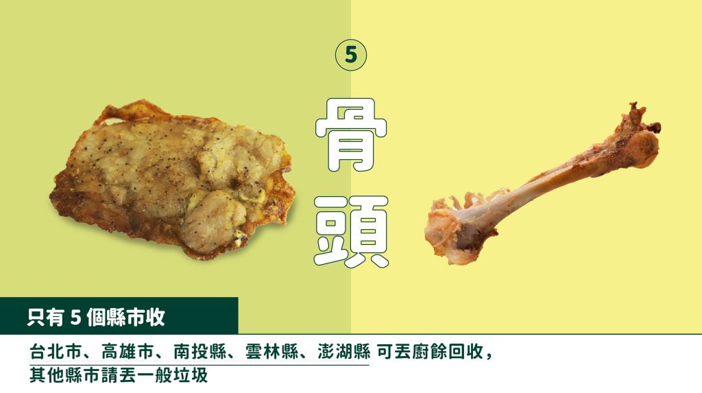 因為骨頭不易完全破碎,豬隻無法吞嚥,如果家戶沒有堆肥廚餘,就應該丟至一般垃圾。