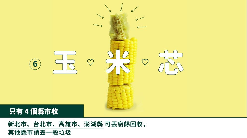 玉米芯:包括玉米殼、筍殼等食材,皆可丟廚餘回收