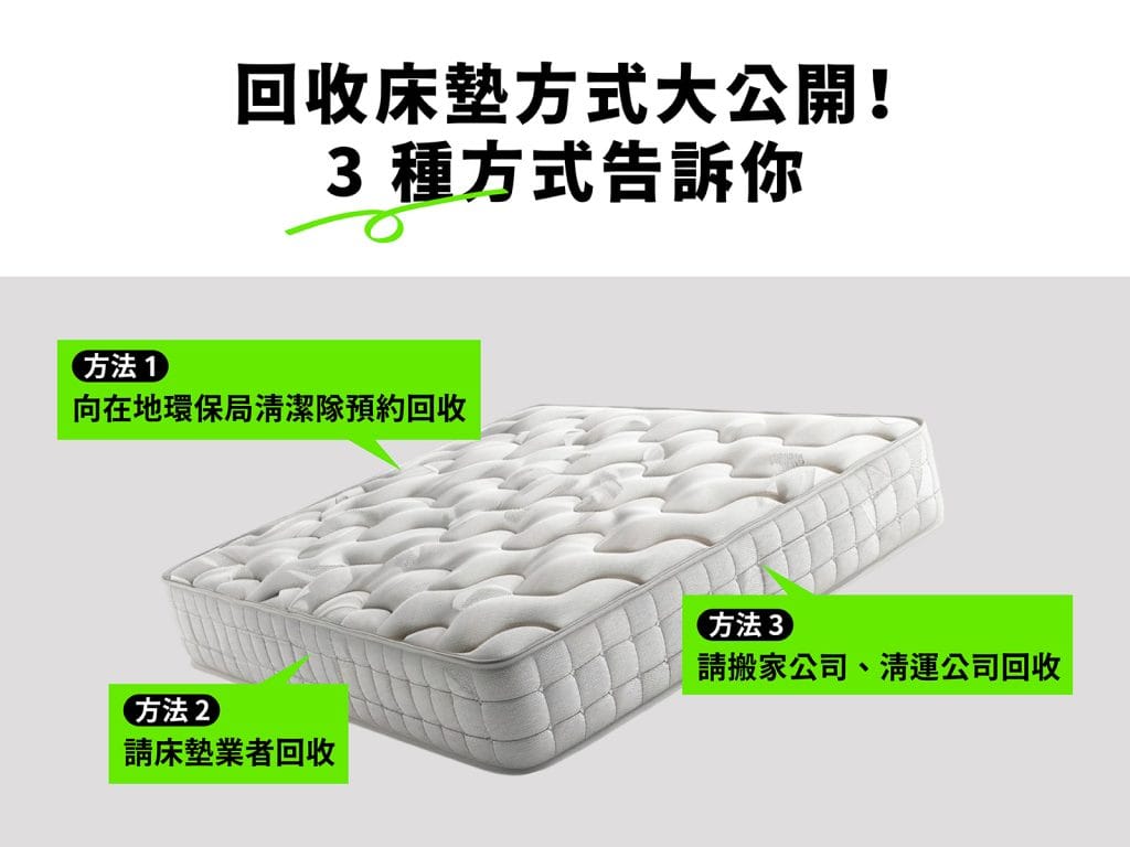 若無法配合清潔隊指定時間,或暫時也沒有購買新床墊的需求,也可以考慮找搬家或清運公司協助回收,通常收費可能是以「車次」來計價,比較適合有好幾項物品要一起清運的情境。