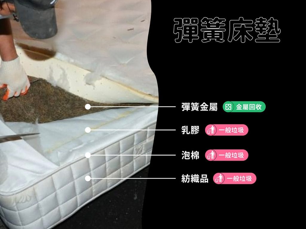 因為彈簧床墊的金屬部分,可歸類為有價金屬,回收製成鋼材。其他床墊填充物包含乳膠、泡棉、紡織品等,回收效益不高。