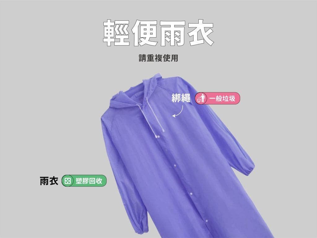 你可能也曾有這種經驗?騎車騎到一半突然下大雨,趕快衝進便利商店,買一件輕便雨衣應急。輕便雨衣如其名,輕薄、方便,但也很容易破損。不能再使用的輕便雨衣該怎麼丟棄?