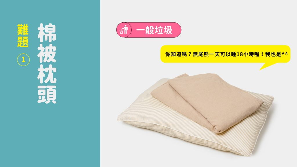 第一道題目,有請大家最常冒出的疑問:「厚棉被到底怎麼丟?」、「棉被、枕頭到底怎麼丟?」、「枕頭、棉被可以回收嗎?」,不會丟的你一點都不孤單,很多人有這樣的疑問。