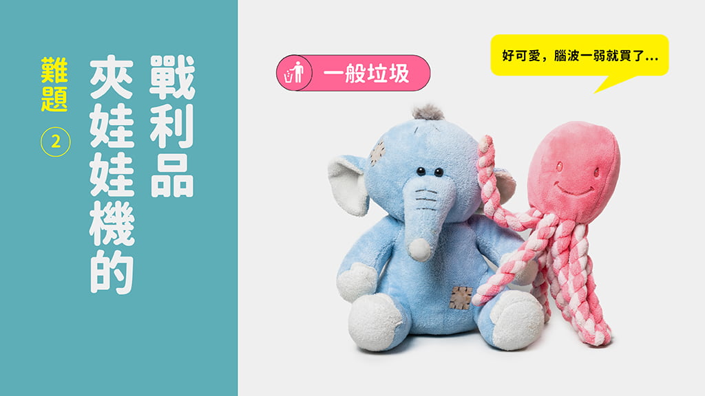 絨毛娃娃多為棉花、纖維布組成,無法回收可以捐給社福團體或分送給身邊有小孩的朋友喔!