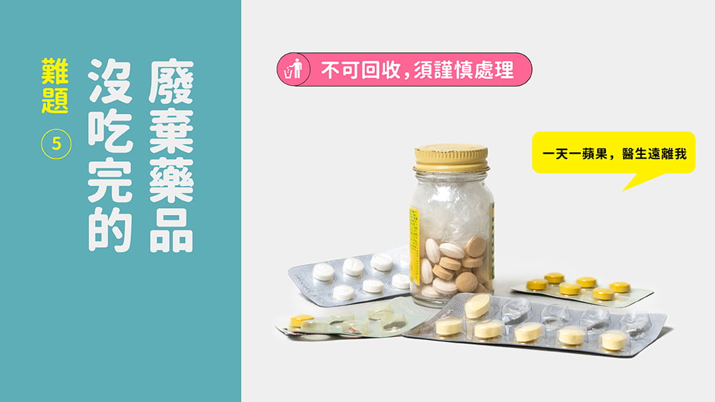 沒吃完的藥,不可回收,需警慎處理,並注意保存期限。這個就不用講求環保物盡其用了哦!