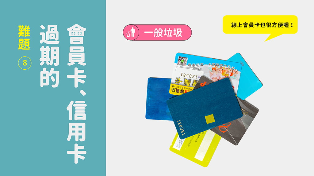 信用卡不能回收哦!由 PVC 塑膠製成的信用卡雖然在塑膠分類中為編號 3,但材質經常添加可塑劑&一些金屬或磁性物質,回收程序困難無法再利用,基於資訊安全請把卡片剪掉之後直接丟到一般垃圾吧。