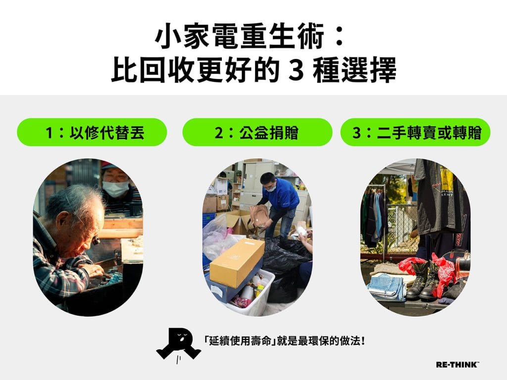 雖然只要正確回收,就能讓廢棄小家電的金屬、塑膠材料重新回到循環,但考慮將廢棄小家電回收前,還有更環保的作法,就是讓小家電繼續被使用。